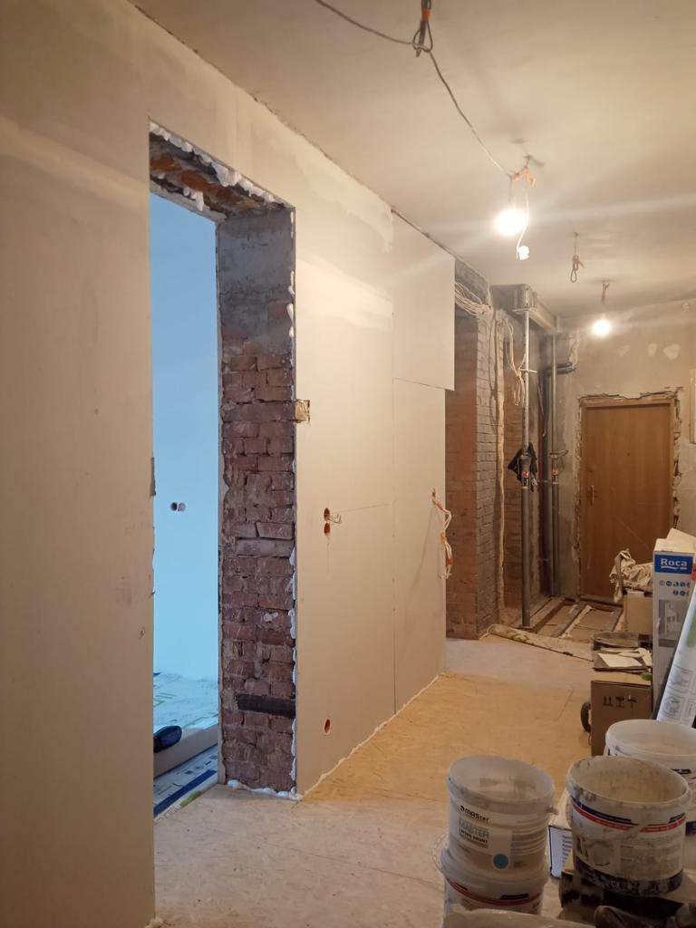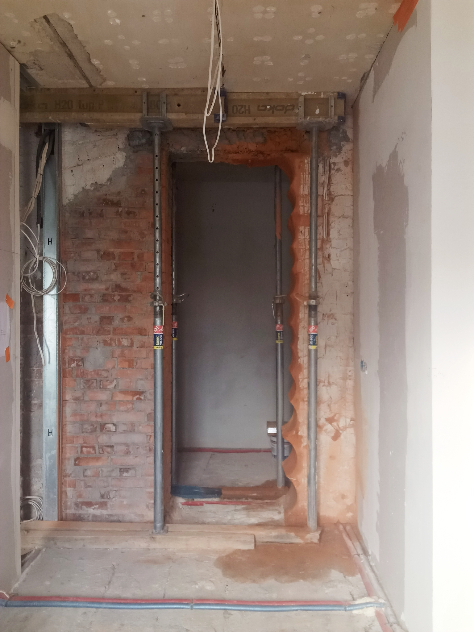 Gdy już posiadamy wszystkie niezbędne pozwolenia, można przystąpić do pracy. Strop w miejscu wyburzanego fragmentu ściany należy podeprzeć stemplami. Następnie wykuwa się otwór na belkę i montuje podciąg - np. stalowy dwuteownik odpowiedniej grubości i długości, powinno to zostać dokładnie określone w projekcie od konstruktora. Dopiero gdy podciąg przejmie obciążenie, można ruszyć dalej z pracami wyburzeniowymi. Ścianę należy rozbierać warstwami, od góry. Najlepiej zacząć od nacięcia cegieł, a następnie skuć je za pomocą młota. W jednym z projektowanych przez nas mieszkań do zronienia nowego otworu drzwiowego w grubej ścianie z cegły wykorzystana została wiertnica. Podyktowane to zostało tym, że zarówno cegła jak i spoiwo okazały się być bardzo twarde, a wyburzanie za pomocą młota pneumatycznego czasochłonne i bardzo głośne.