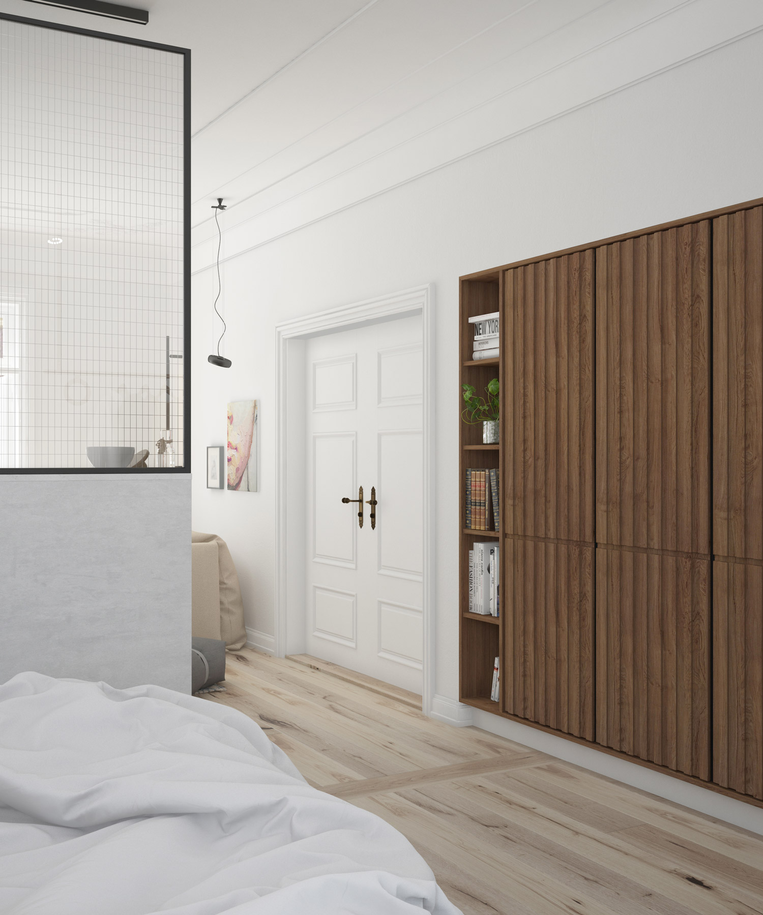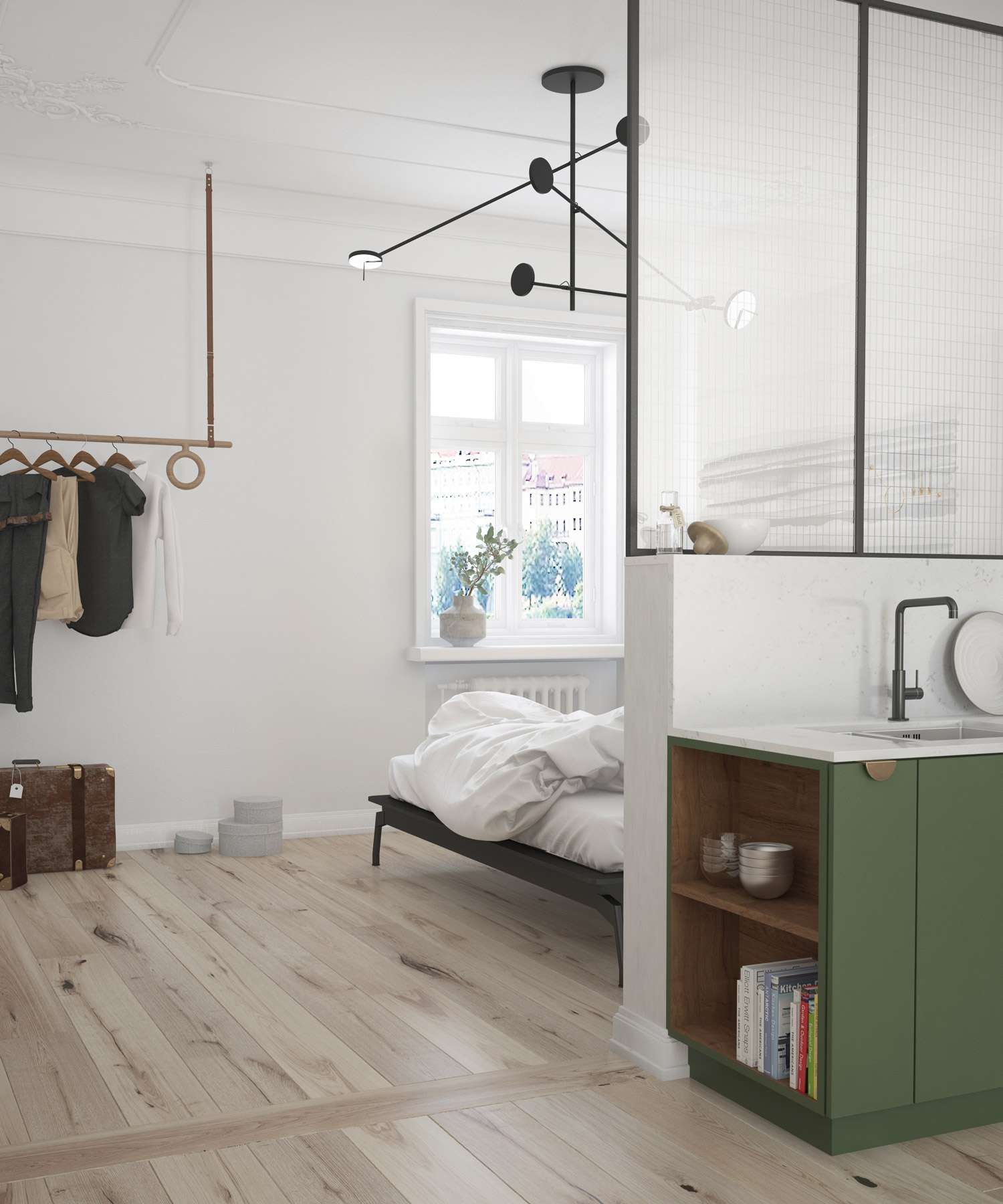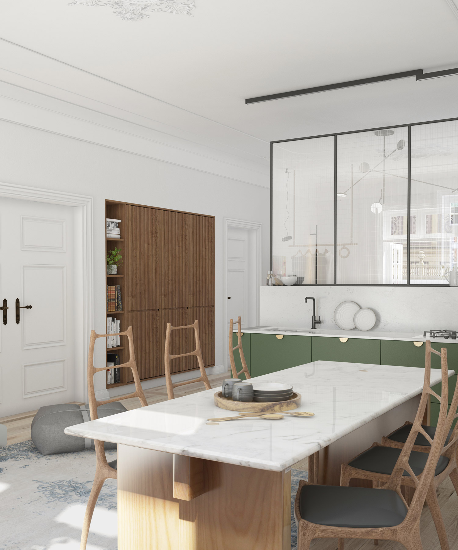 Projekt koncepcyjny kawalerki w kamienicy to aranżacja otwartej przestrzeni, łączącej sypialnię, kuchnię, jadalnię i strefę wypoczynkową. Centralnym elementem jest kuchnia w odcieniu zieleni, która wyznacza podział funkcjonalny wnętrza. Nad zabudową umiejscowiona została ścianka ze zbrojonego szkła w cienkiej stalowej ramie. Walory mieszkania podkreślają zachowana oryginalna stolarka drzwiowa i okienna oraz odrestaurowane sztukaterie. Minimalistyczne oświetlenie dobrane zostało tak, aby eksponować zarówno materiały, jak i detale architektoniczne.