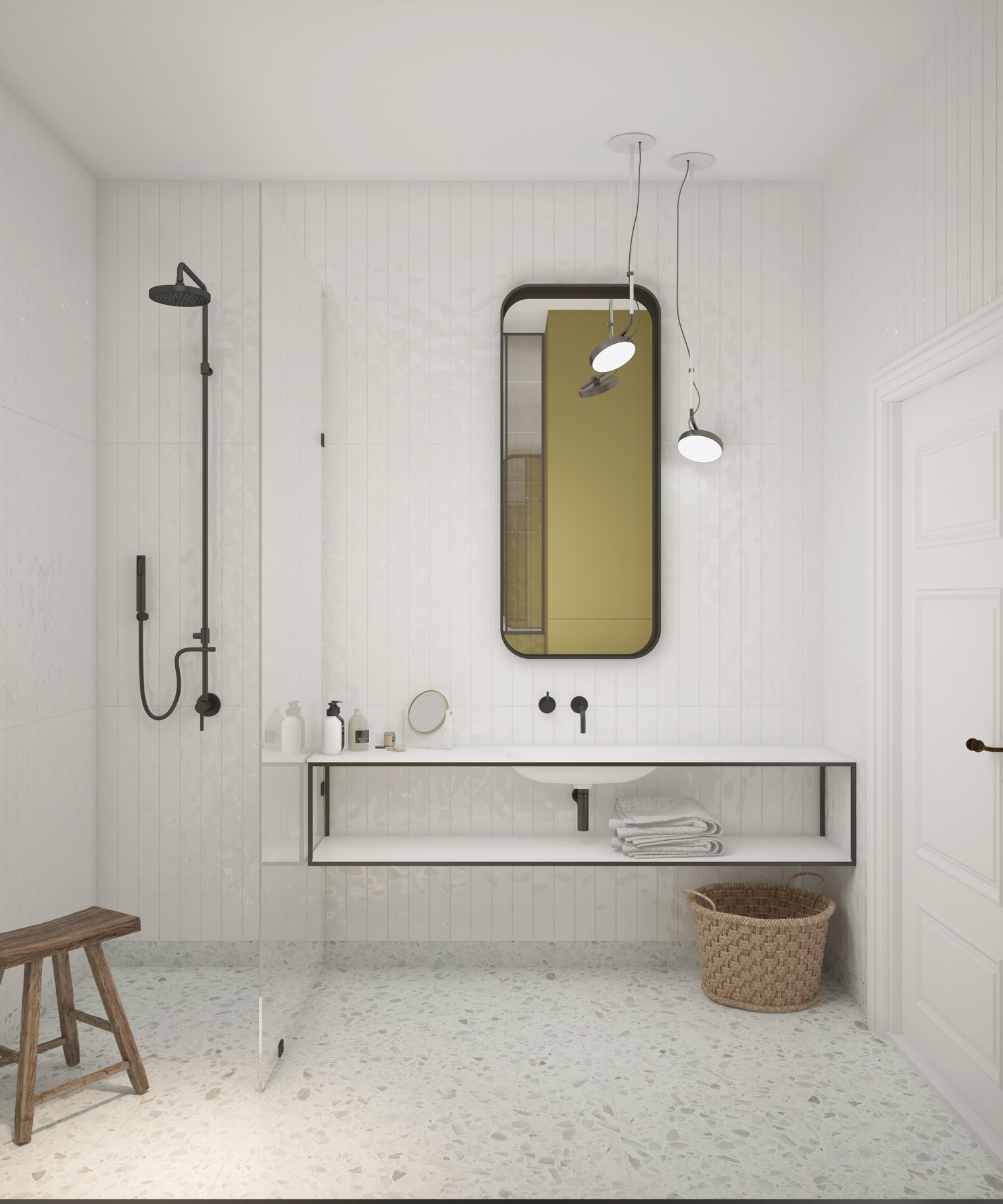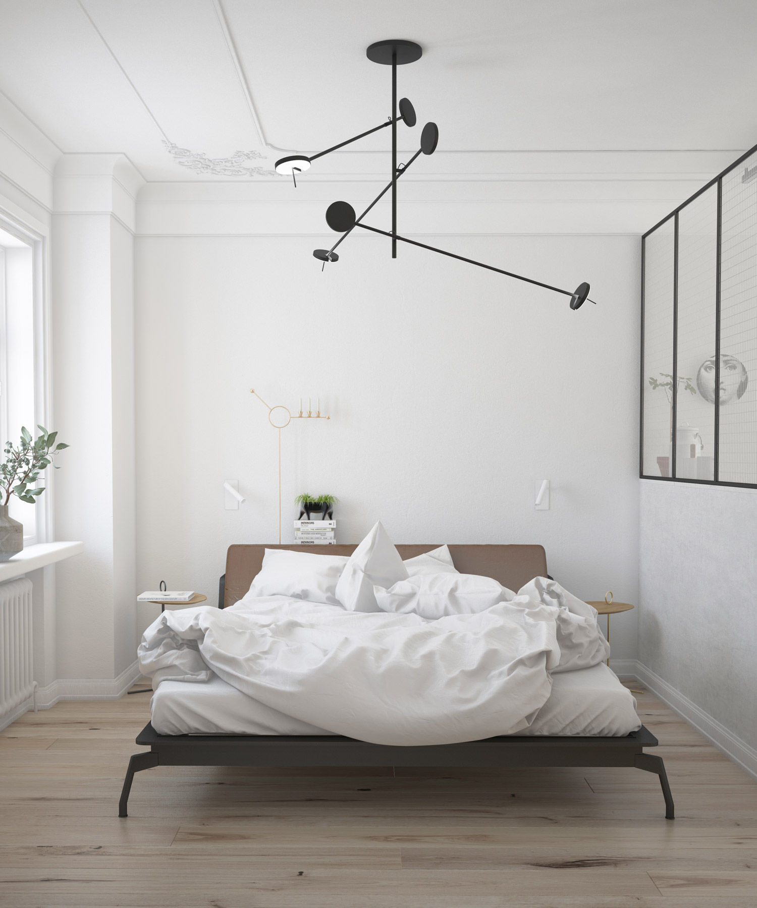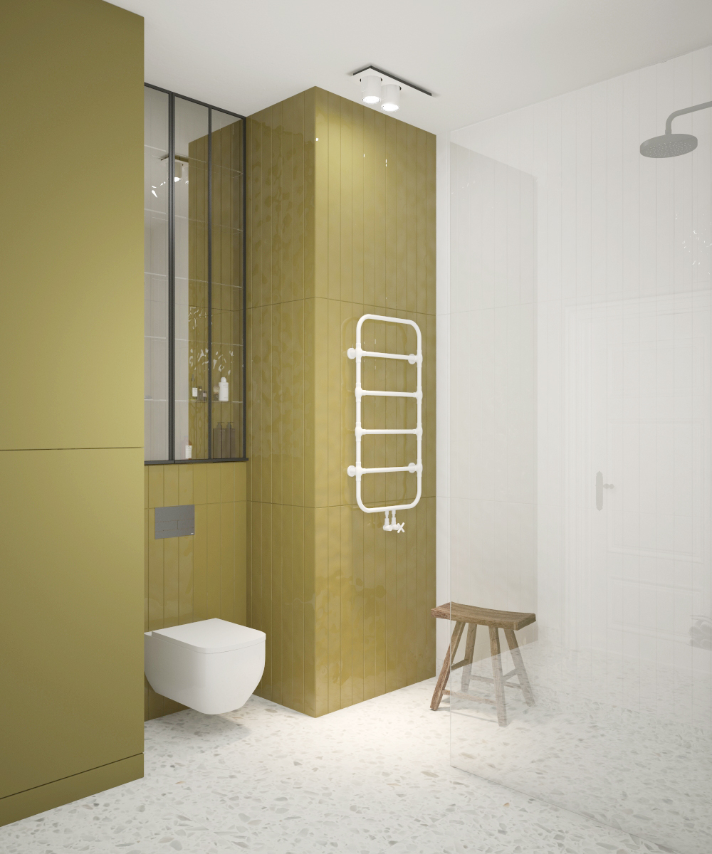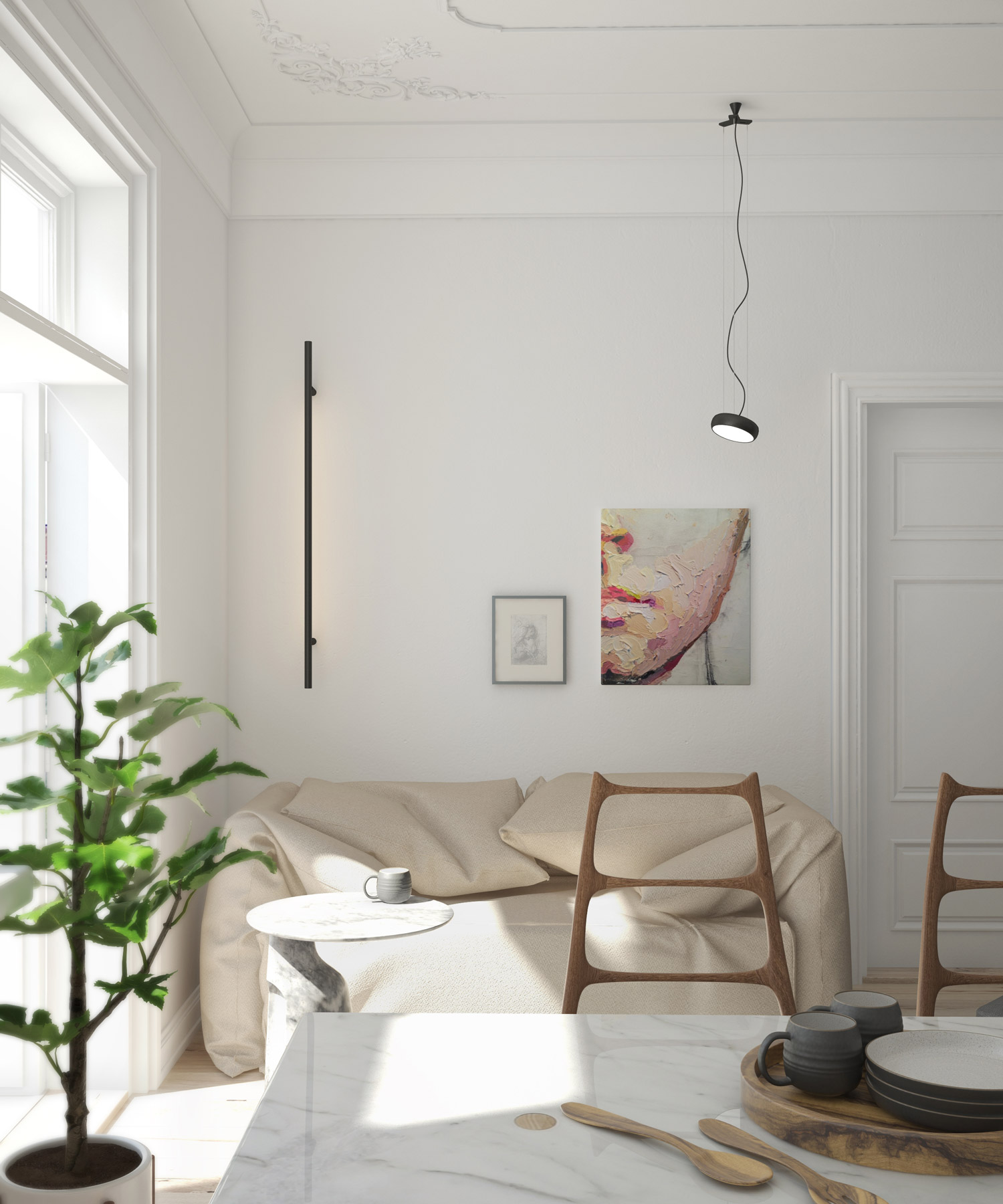 Projekt koncepcyjny kawalerki w kamienicy to aranżacja otwartej przestrzeni, łączącej sypialnię, kuchnię, jadalnię i strefę wypoczynkową. Centralnym elementem jest kuchnia w odcieniu zieleni, która wyznacza podział funkcjonalny wnętrza. Nad zabudową umiejscowiona została ścianka ze zbrojonego szkła w cienkiej stalowej ramie. Walory mieszkania podkreślają zachowana oryginalna stolarka drzwiowa i okienna oraz odrestaurowane sztukaterie. Minimalistyczne oświetlenie dobrane zostało tak, aby eksponować zarówno materiały, jak i detale architektoniczne.