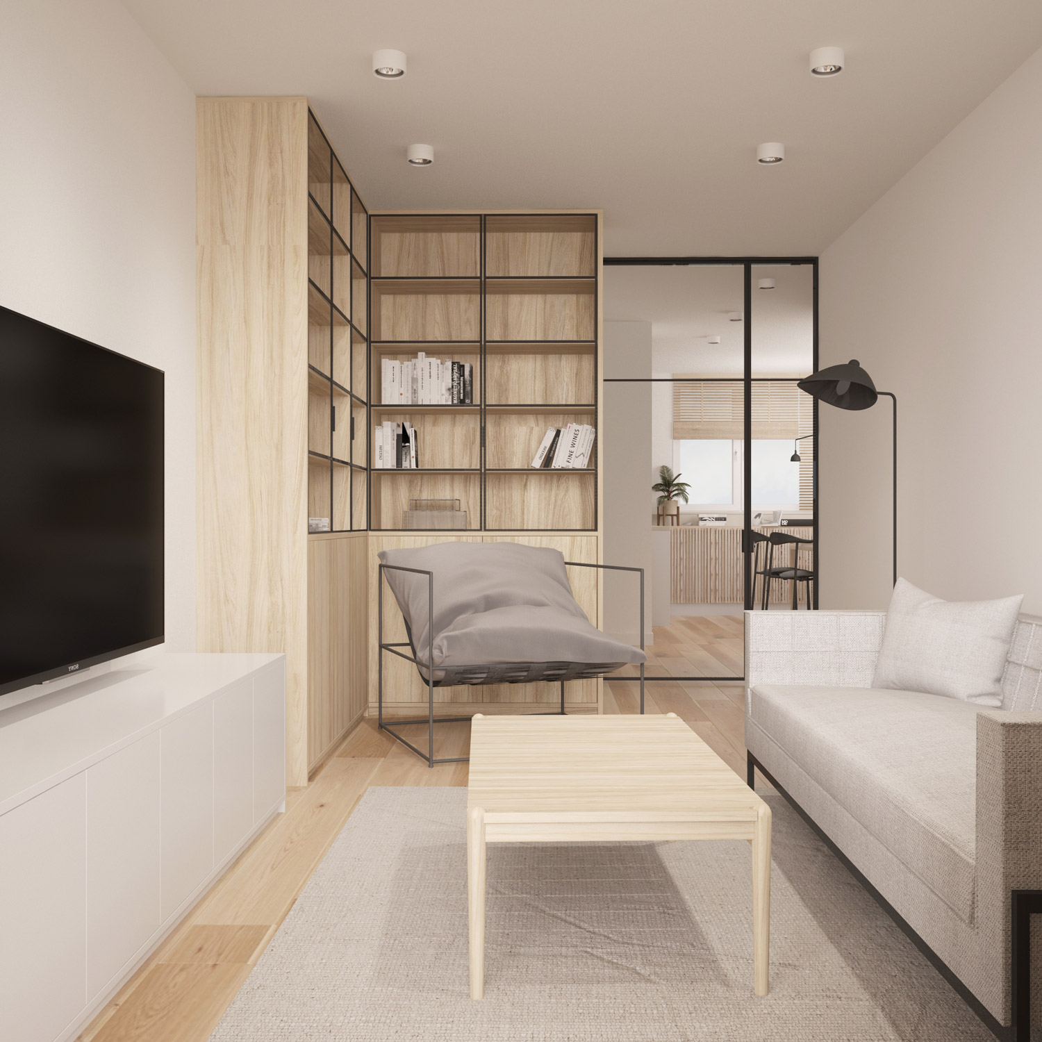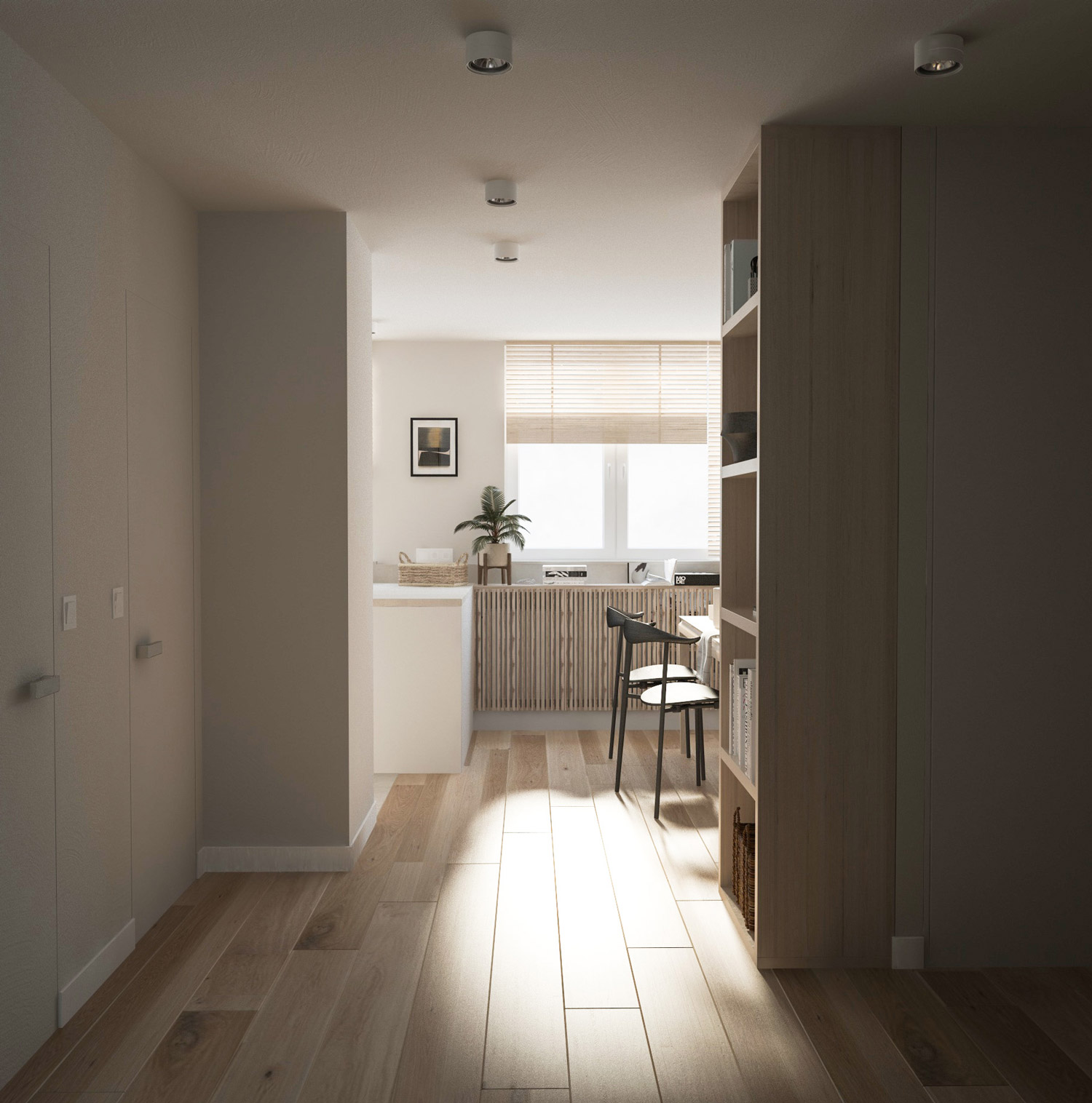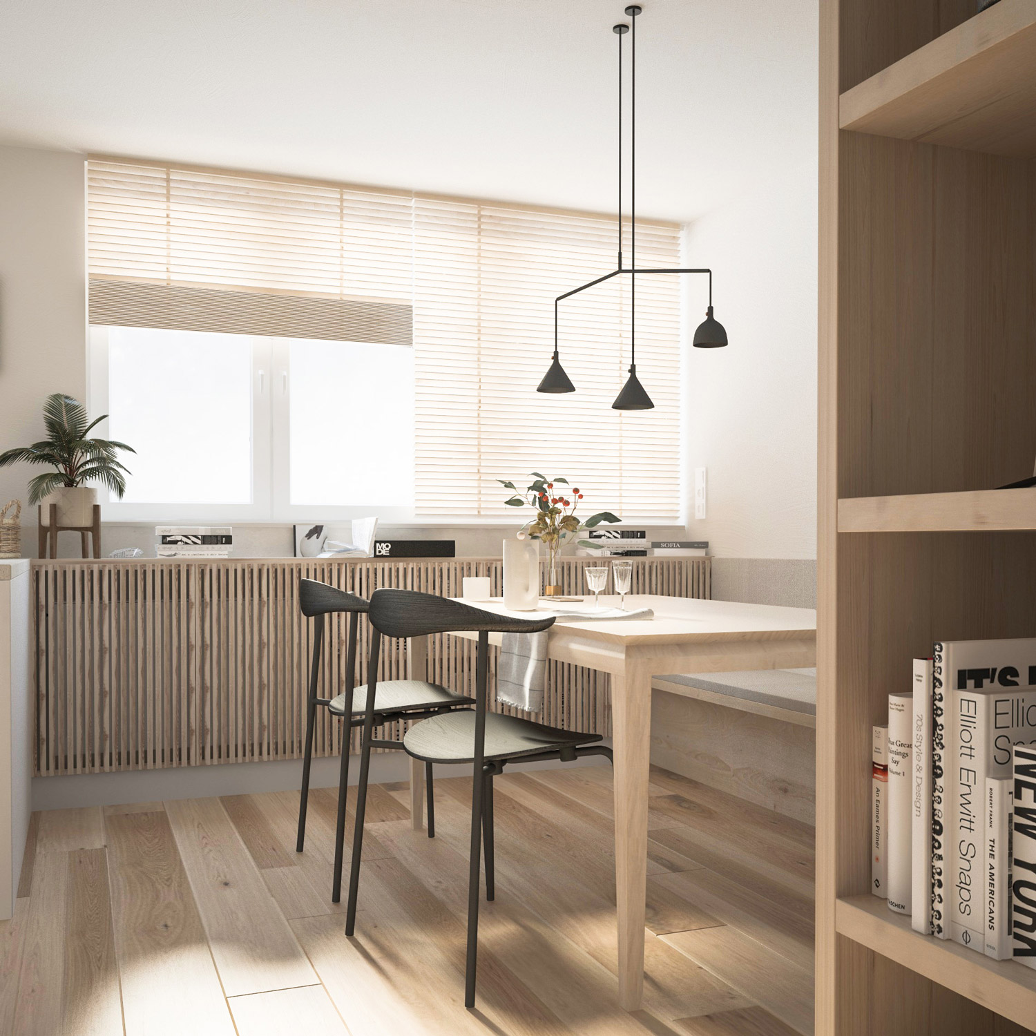 Remont mieszkania z rynku wtórnego miał na celu dostosowanie przestrzeni do potrzeb domowników. Zmieniono układ funkcjonalny, likwidując część ścian działowych i tworząc otwartą strefę kuchenno-jadalnianą, będącą priorytetem inwestorów. Wprowadzono minimalistyczne, naturalne materiały oraz stonowaną paletę barw. Projekt uzupełniono o praktyczne rozwiązania do przechowywania i nowoczesne oświetlenie. Modernizacja podniosła komfort użytkowania typowego mieszkania w wielkiej płycie.