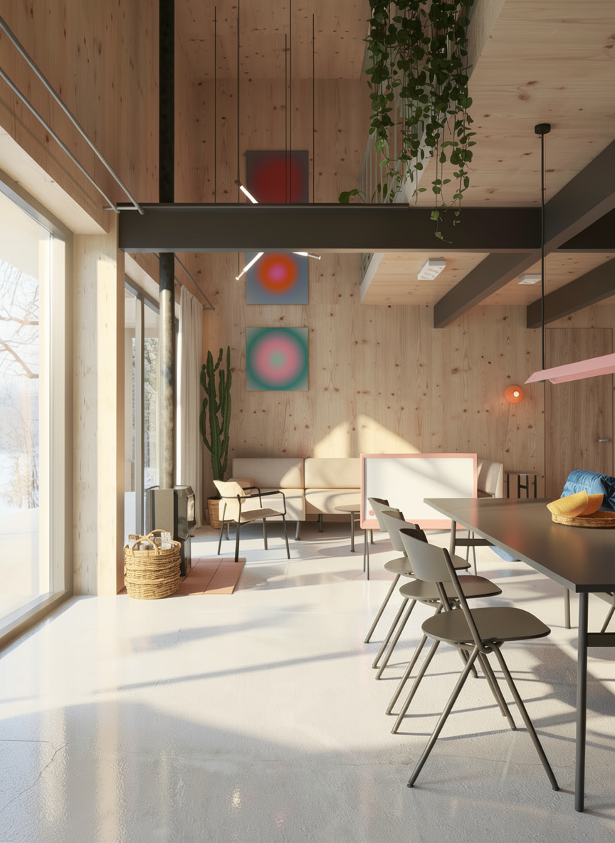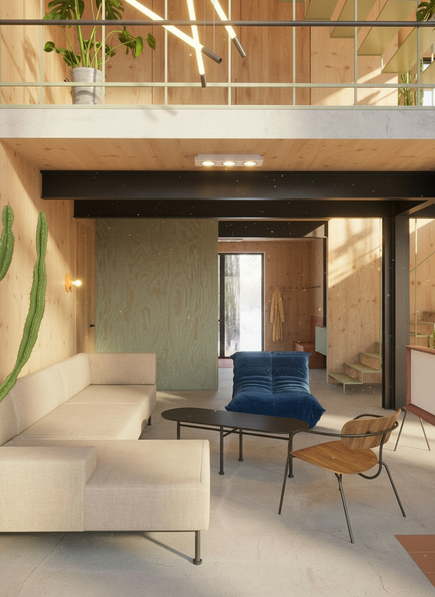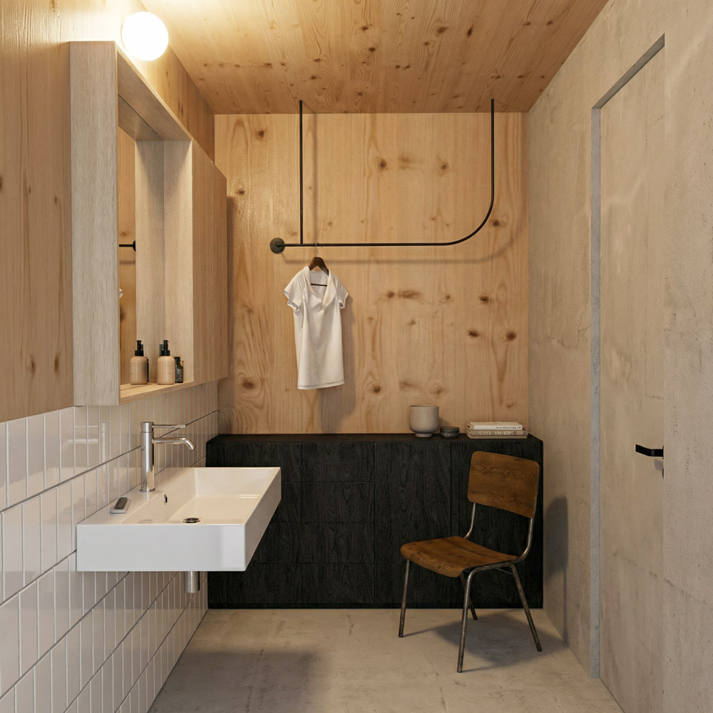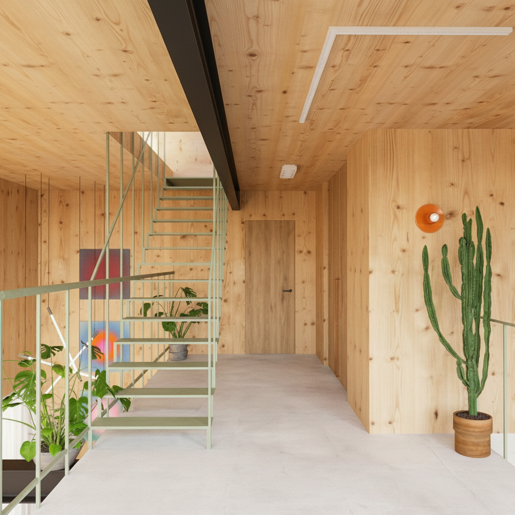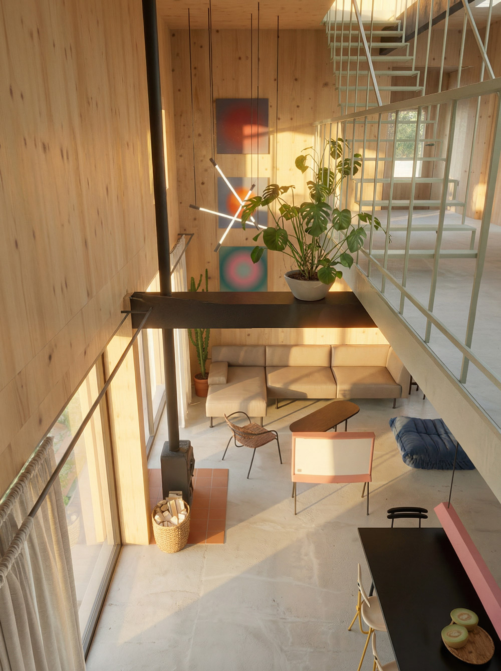 Dom o trzech kondygnacjach, którego architekturę zaprojektowano w technologii CLT z prefabrykowanych płyt z drewna klejonego krzyżowo (projekt arch. Kameleonlab). Budynek przeznaczony jest dla trzech stałych użytkowników i posiada dwie sypialnie gościnne. Na parterze znajduje się dwukondygnacyjna strefa dzienna połączona z kuchnią oraz dwiema sypialniami z łazienkami. Wyższe piętra przeznaczono na pokoje gościnne. Wnętrza definiuje widoczna konstrukcja drewniana oraz betonowe posadzki, co nadaje im surowy, ale ciepły charakter. Naturalne materiały uzupełniają kolorowe akcenty mebli i wyposażenia.