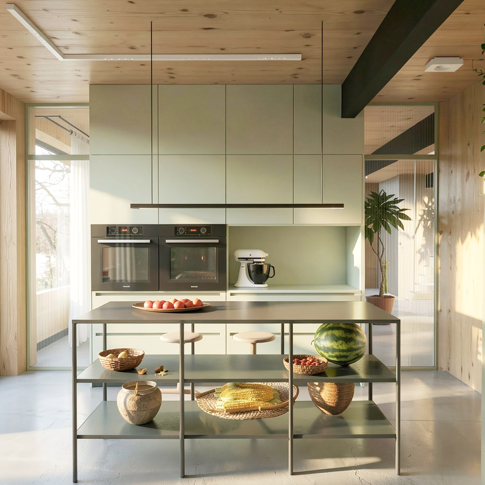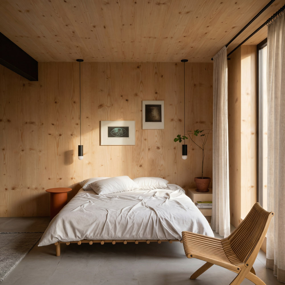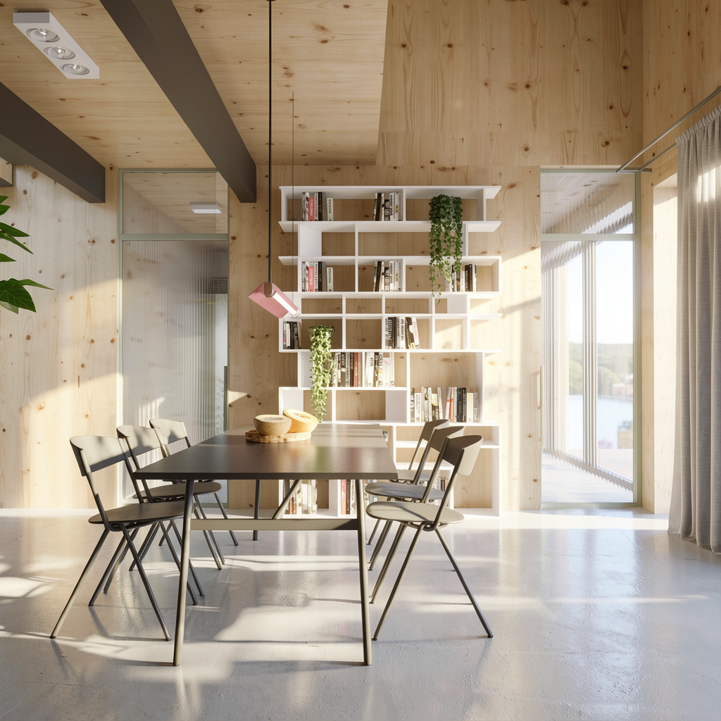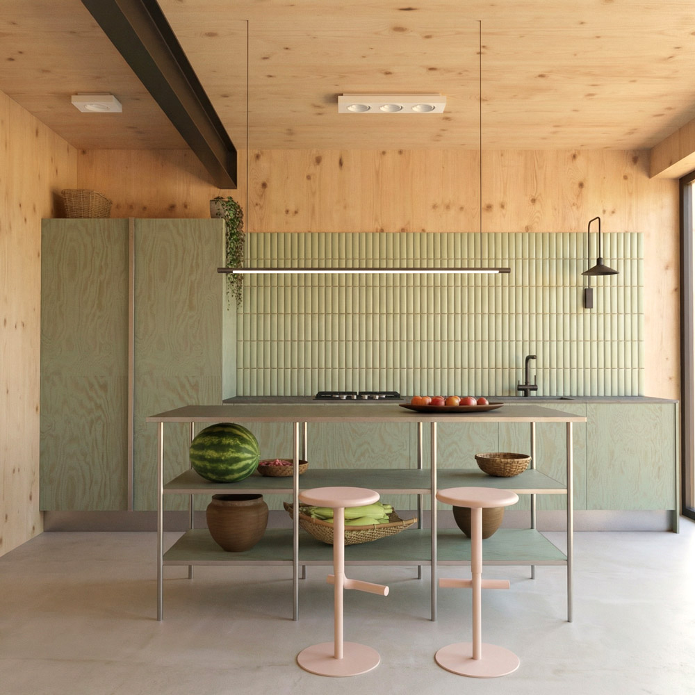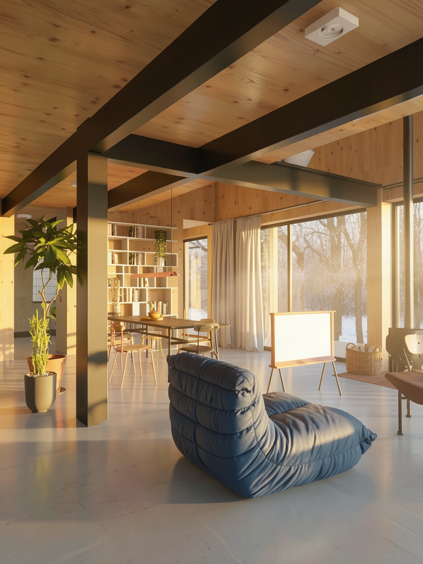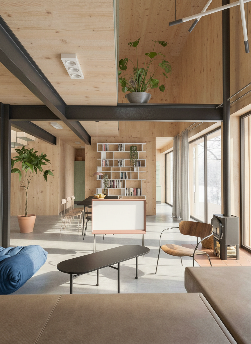 Dom o trzech kondygnacjach, którego architekturę zaprojektowano w technologii CLT z prefabrykowanych płyt z drewna klejonego krzyżowo (projekt arch. Kameleonlab). Budynek przeznaczony jest dla trzech stałych użytkowników i posiada dwie sypialnie gościnne. Na parterze znajduje się dwukondygnacyjna strefa dzienna połączona z kuchnią oraz dwiema sypialniami z łazienkami. Wyższe piętra przeznaczono na pokoje gościnne. Wnętrza definiuje widoczna konstrukcja drewniana oraz betonowe posadzki, co nadaje im surowy, ale ciepły charakter. Naturalne materiały uzupełniają kolorowe akcenty mebli i wyposażenia.
