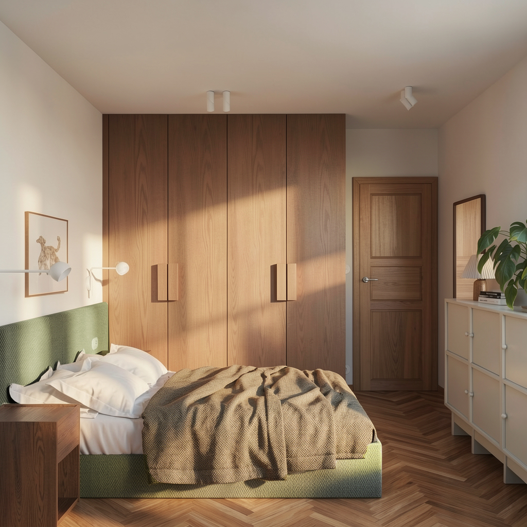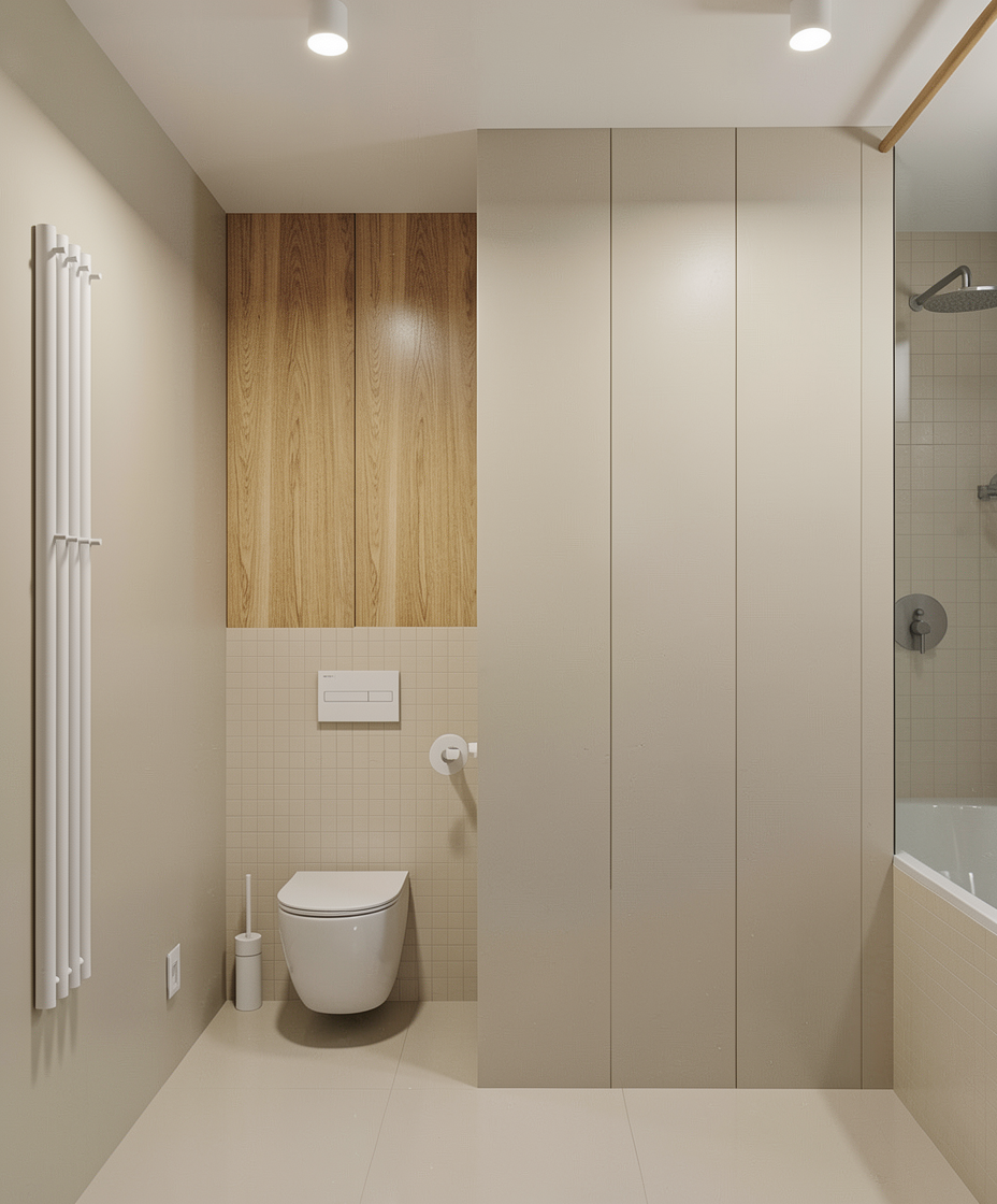 Projekt wnętrza mieszkania w bloku z lat 80., oparty na świadomym zachowaniu istniejących elementów. Inwestorom zależało na pozostawieniu dębowego parkietu, drewnianych drzwi oraz zabudowy kuchennej, które stały się bazą dla nowej aranżacji. Kuchnia została funkcjonalnie przeprojektowana, wprowadzone zmiany poprawiły ergonomię i codzienne użytkowanie tej przestrzeni. We wnętrzu dominują jasne, ciepłe kolory, budujące spójną i przyjazną atmosferę. Kontrast stanowi sypialnia, utrzymana w chłodniejszej, bardziej wyciszonej tonacji.