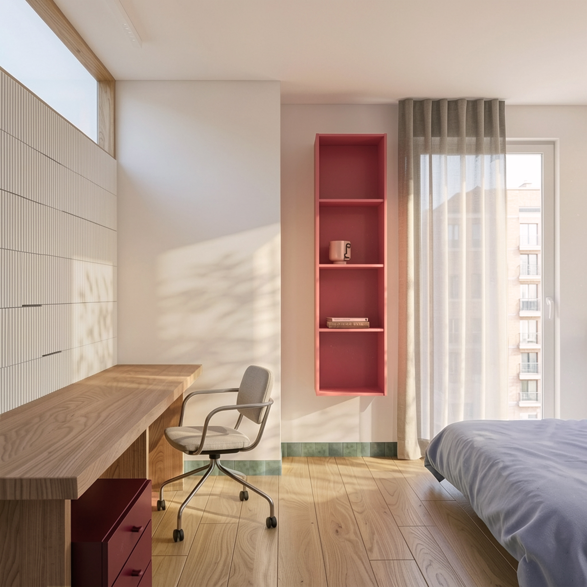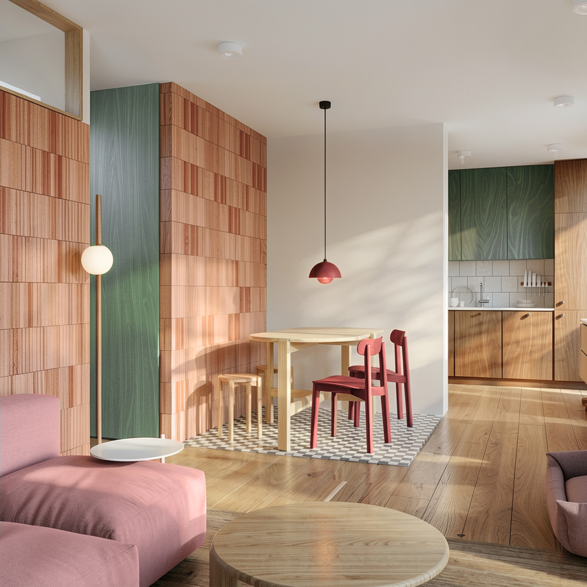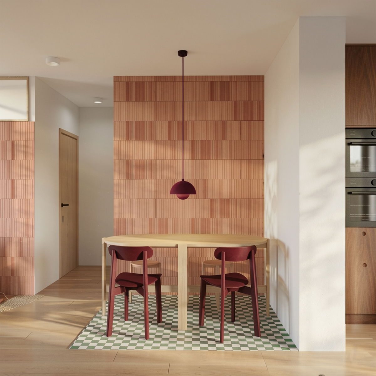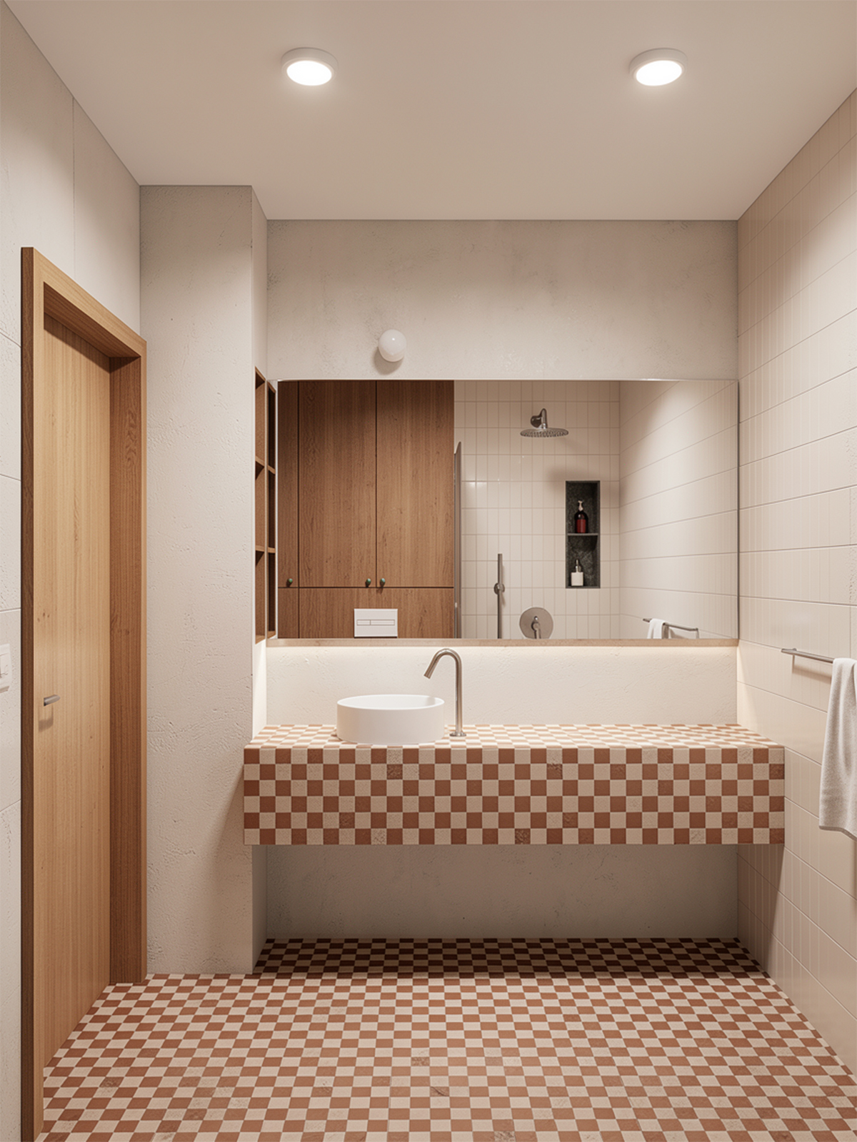 Projekt mieszkania opiera się na odejściu od standardowych rozwiązań materiałowych i wyrazistej pracy z fakturą. Głównym akcentem jest surowa ściana z pustaków ceramicznych w salonie i jadalni, która nadaje charakter całej przestrzeni dziennej. Sypialnia została zaprojektowana jako wielofunkcyjna przestrzeń z miejscem do pracy i garderobą, a naświetle między pomieszczeniami zwiększa dostęp naturalnego światła. Spójność projektu budują dopracowane detale oraz powtarzające się motywy materiałowe, takie jak szachownica pojawiająca się w jadalni i łazience.