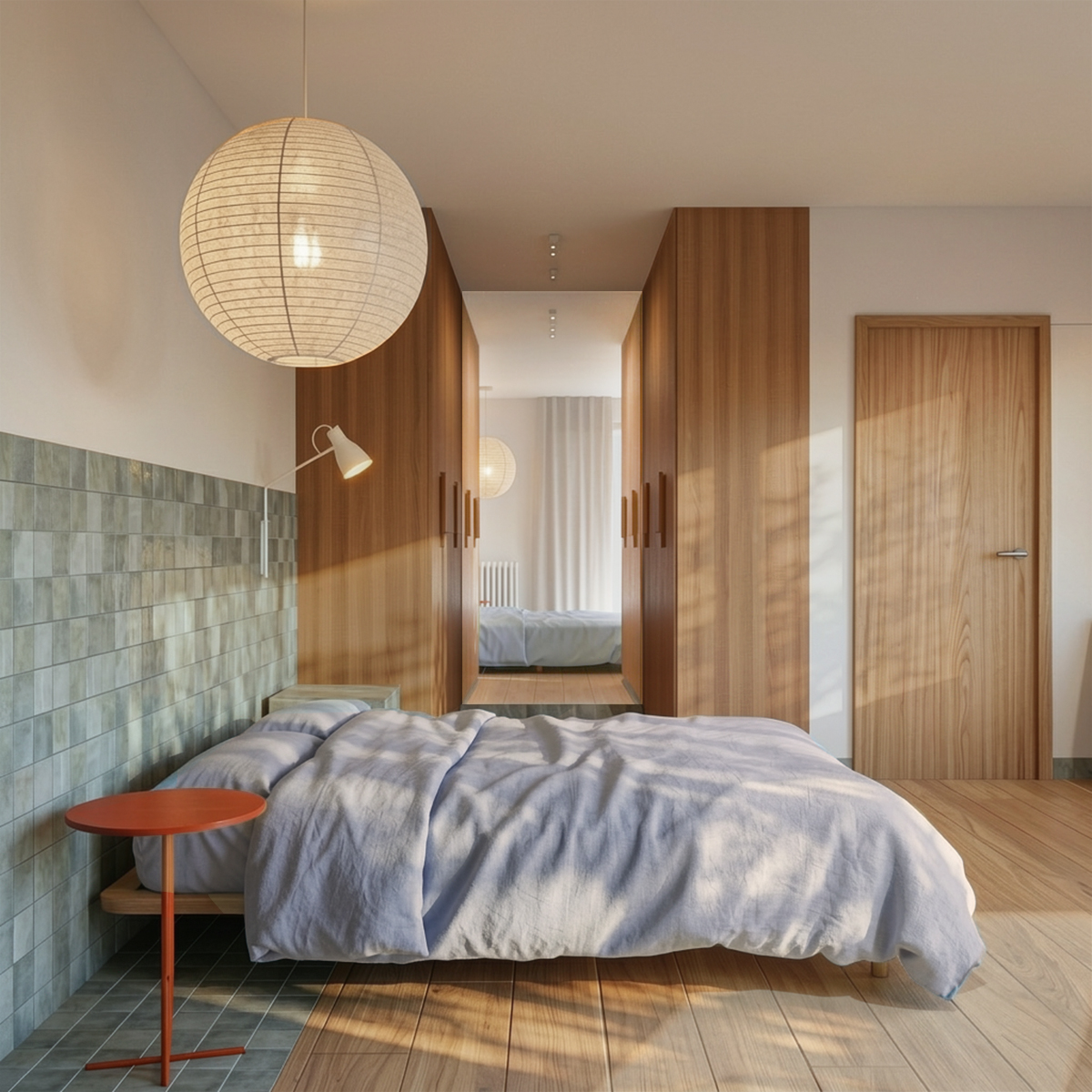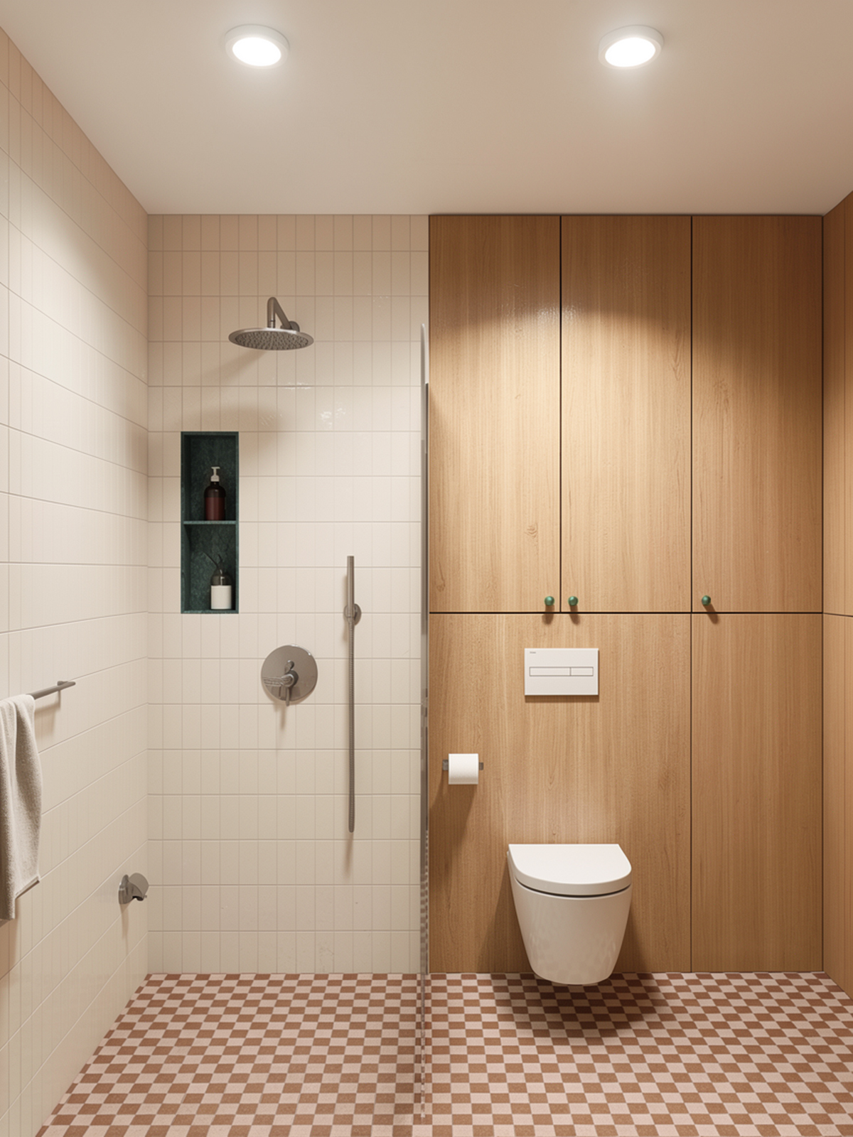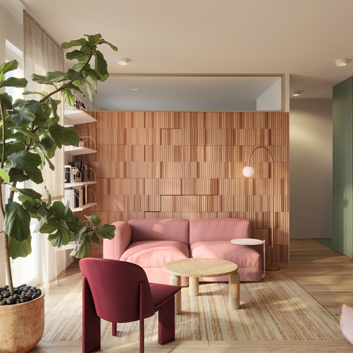 Projekt mieszkania opiera się na odejściu od standardowych rozwiązań materiałowych i wyrazistej pracy z fakturą. Głównym akcentem jest surowa ściana z pustaków ceramicznych w salonie i jadalni, która nadaje charakter całej przestrzeni dziennej. Sypialnia została zaprojektowana jako wielofunkcyjna przestrzeń z miejscem do pracy i garderobą, a naświetle między pomieszczeniami zwiększa dostęp naturalnego światła. Spójność projektu budują dopracowane detale oraz powtarzające się motywy materiałowe, takie jak szachownica pojawiająca się w jadalni i łazience.