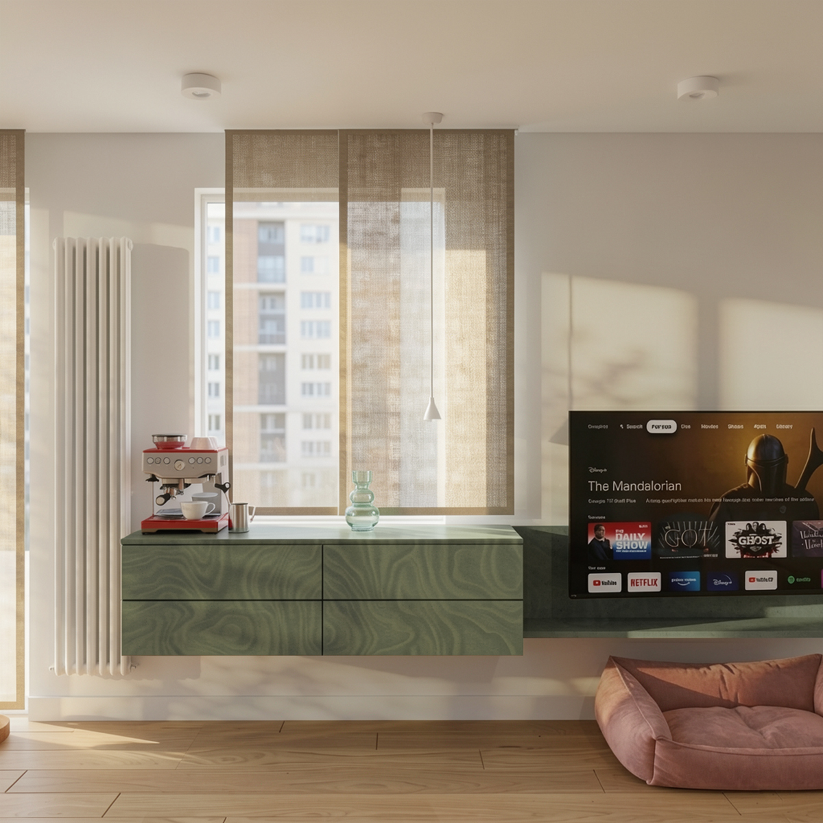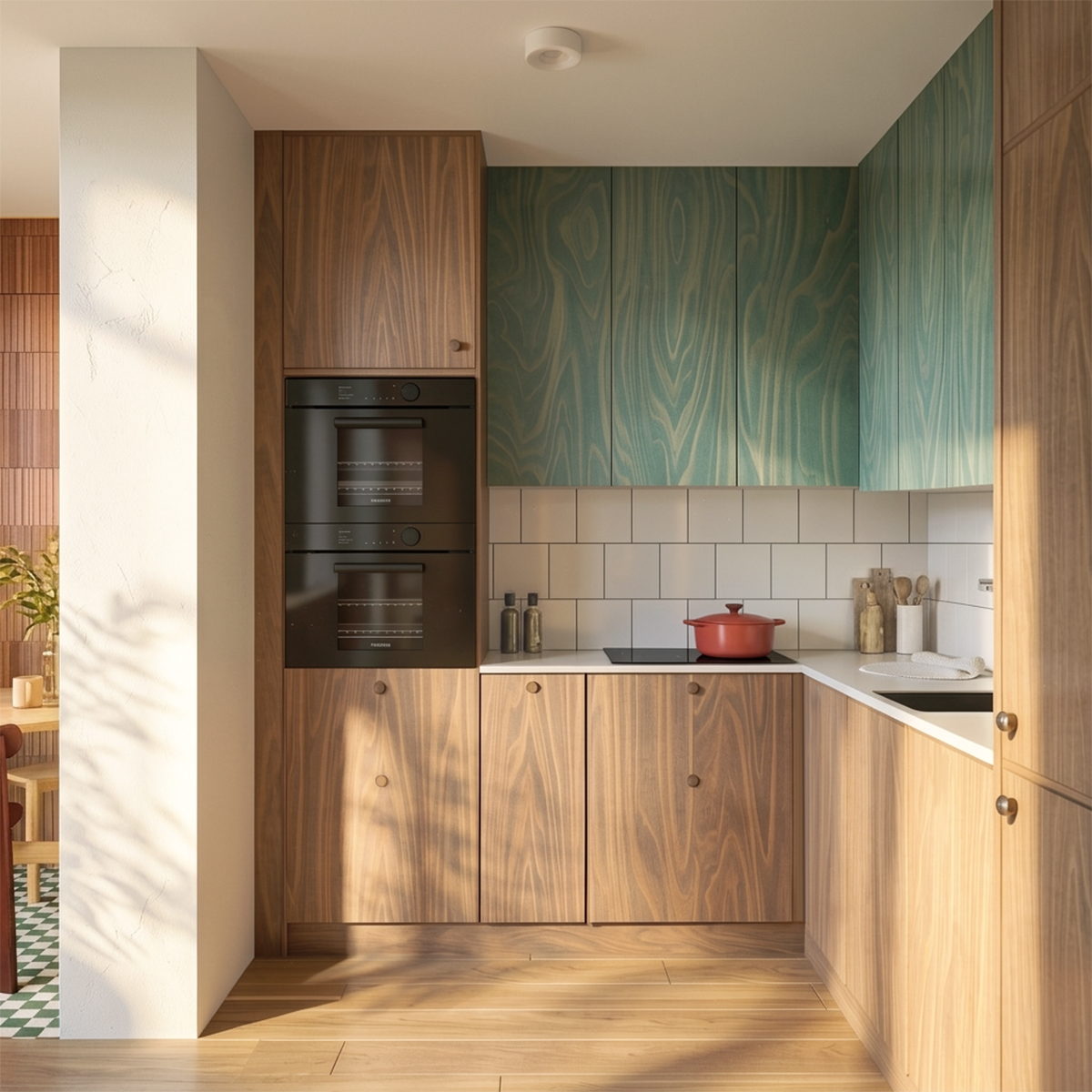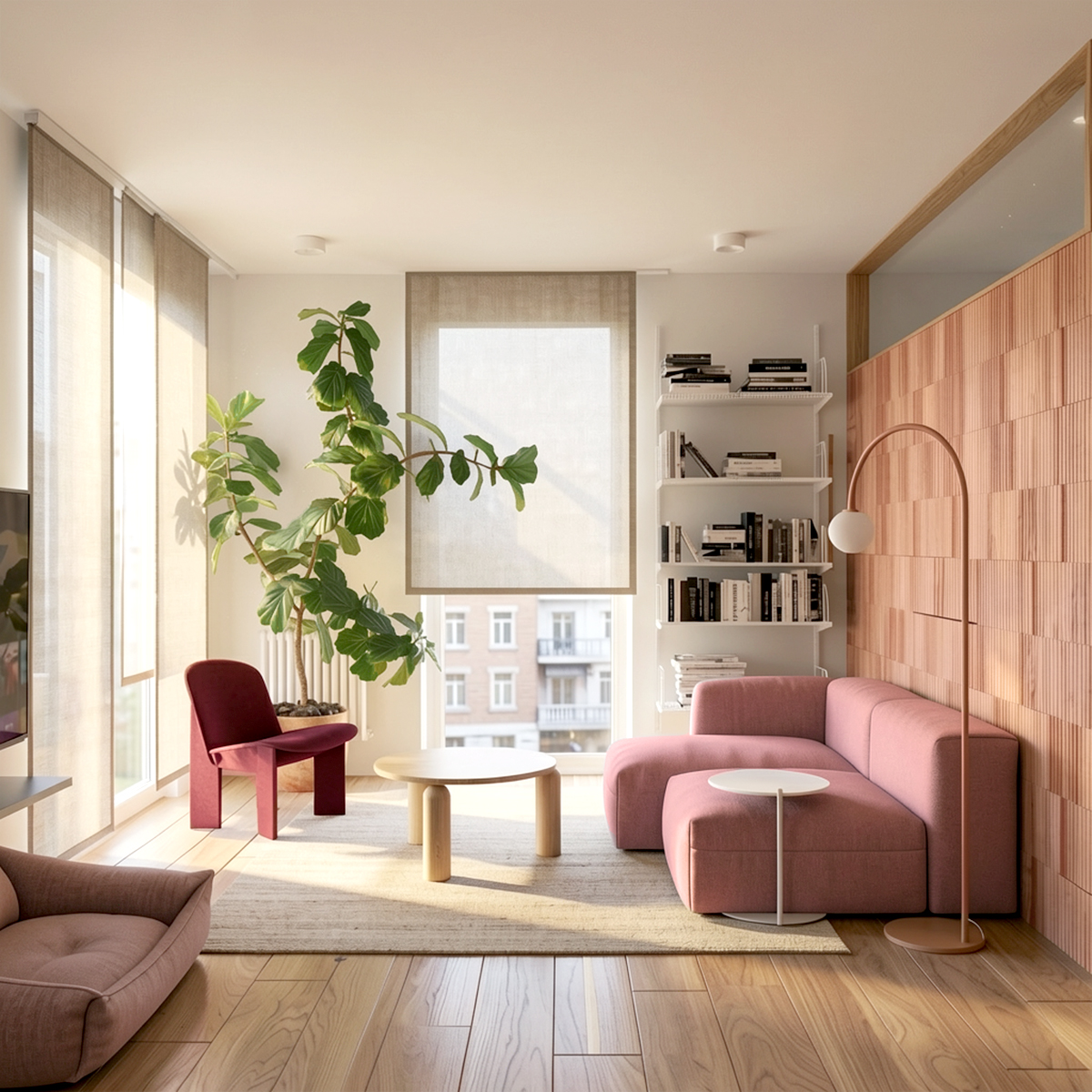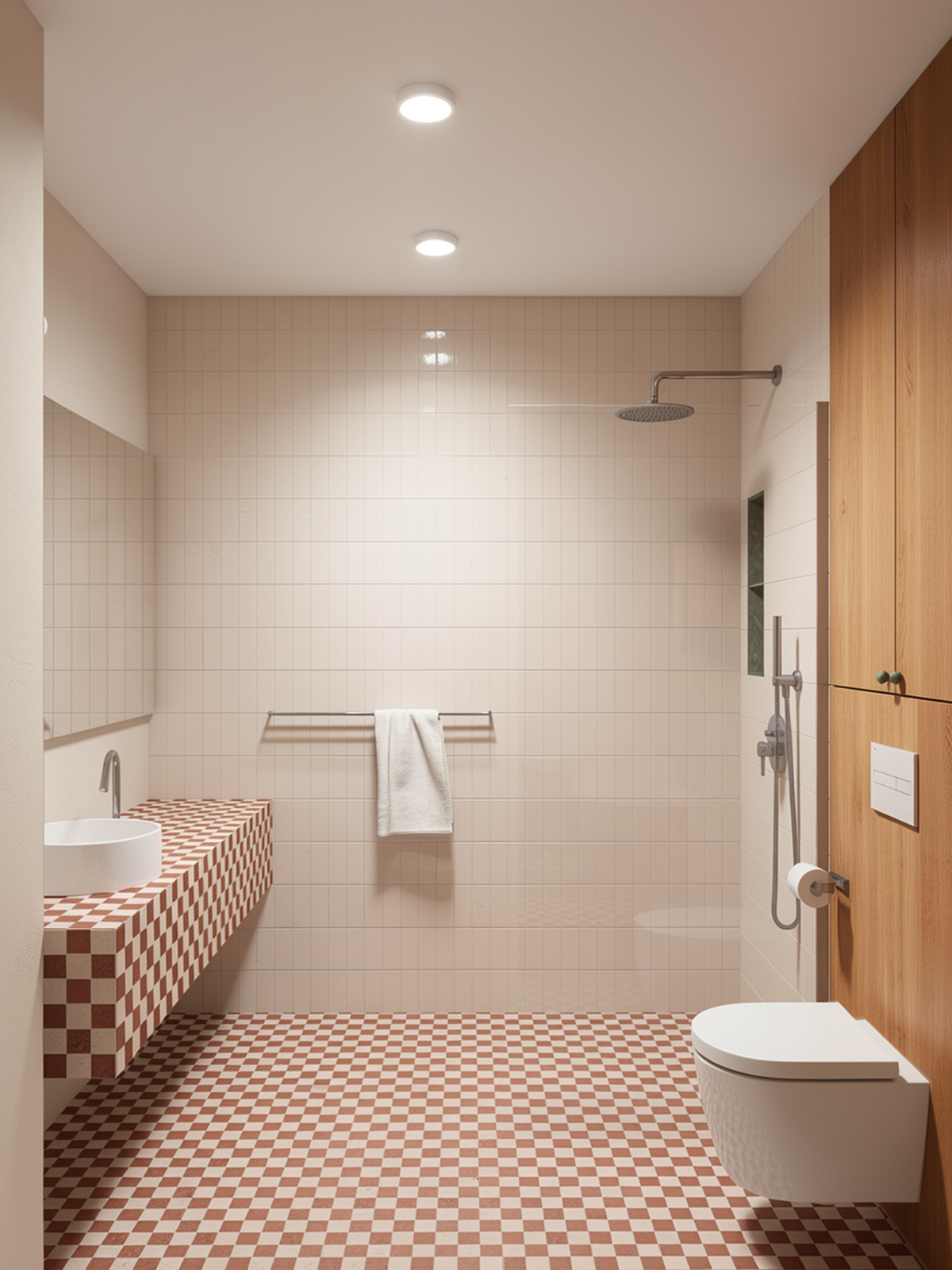 Projekt mieszkania opiera się na odejściu od standardowych rozwiązań materiałowych i wyrazistej pracy z fakturą. Głównym akcentem jest surowa ściana z pustaków ceramicznych w salonie i jadalni, która nadaje charakter całej przestrzeni dziennej. Sypialnia została zaprojektowana jako wielofunkcyjna przestrzeń z miejscem do pracy i garderobą, a naświetle między pomieszczeniami zwiększa dostęp naturalnego światła. Spójność projektu budują dopracowane detale oraz powtarzające się motywy materiałowe, takie jak szachownica pojawiająca się w jadalni i łazience.