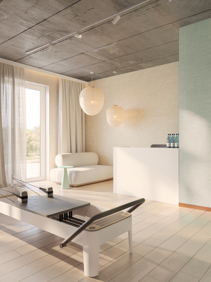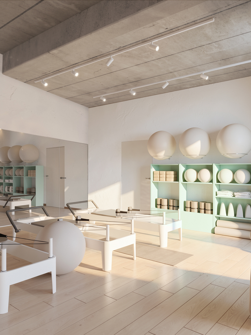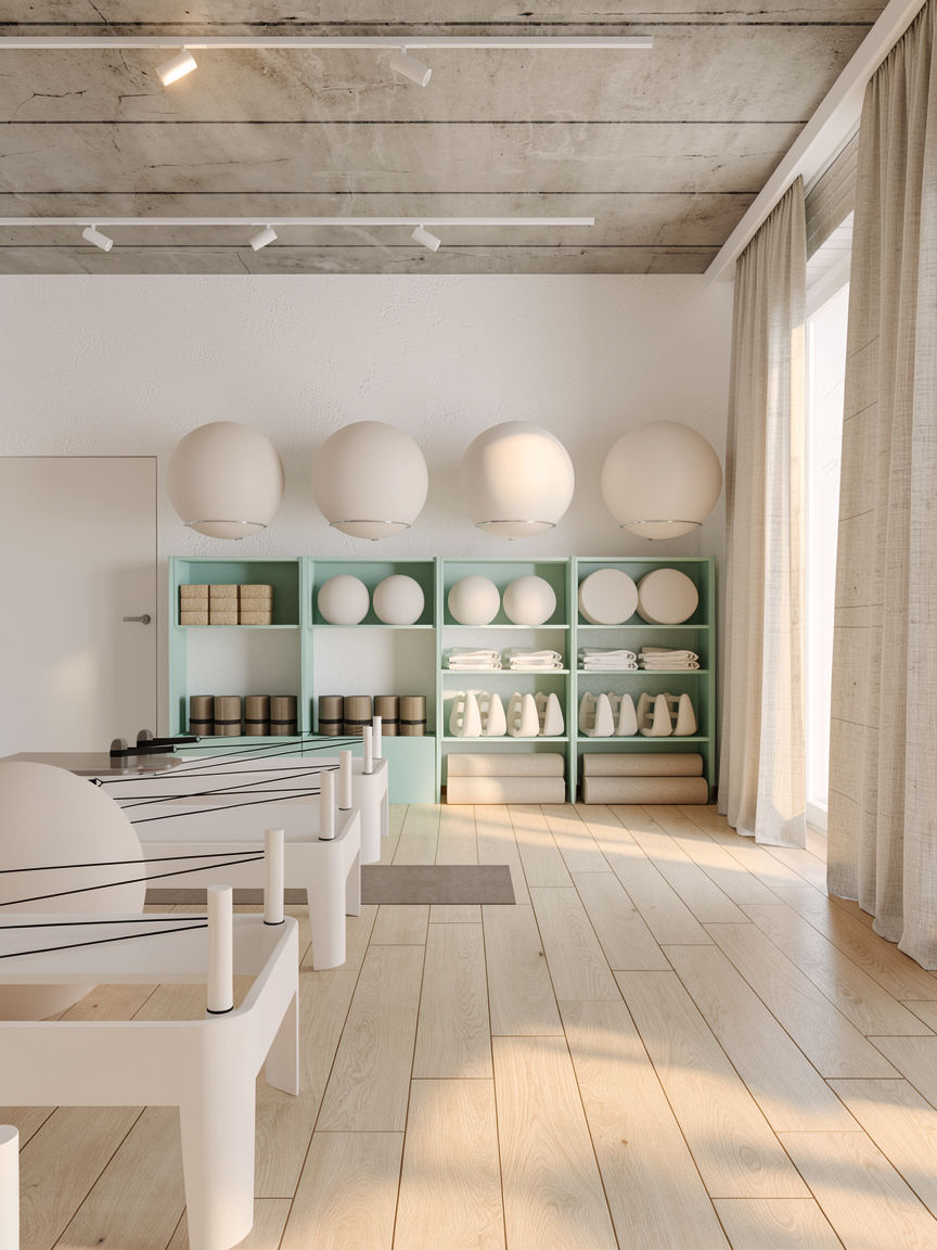 Projekt sali do pilatesu łączy funkcjonalność z delikatną, wyciszającą estetyką. Jasne drewno na podłodze oraz ciepłe, neutralne ściany tworzą tło dla aktywności, a wysokie okna z miękkimi zasłonami wprowadzają dużą ilość naturalnego światła. Wnętrze jest uporządkowane i czytelnie zorganizowane – stanowiska do ćwiczeń rozmieszczono z zachowaniem komfortowych odległości, a otwarte regały eksponują sprzęt w estetyczny sposób. Subtelne akcenty w odcieniach szałwii równoważą naturalne materiały i surowy charakter betonowego sufitu.