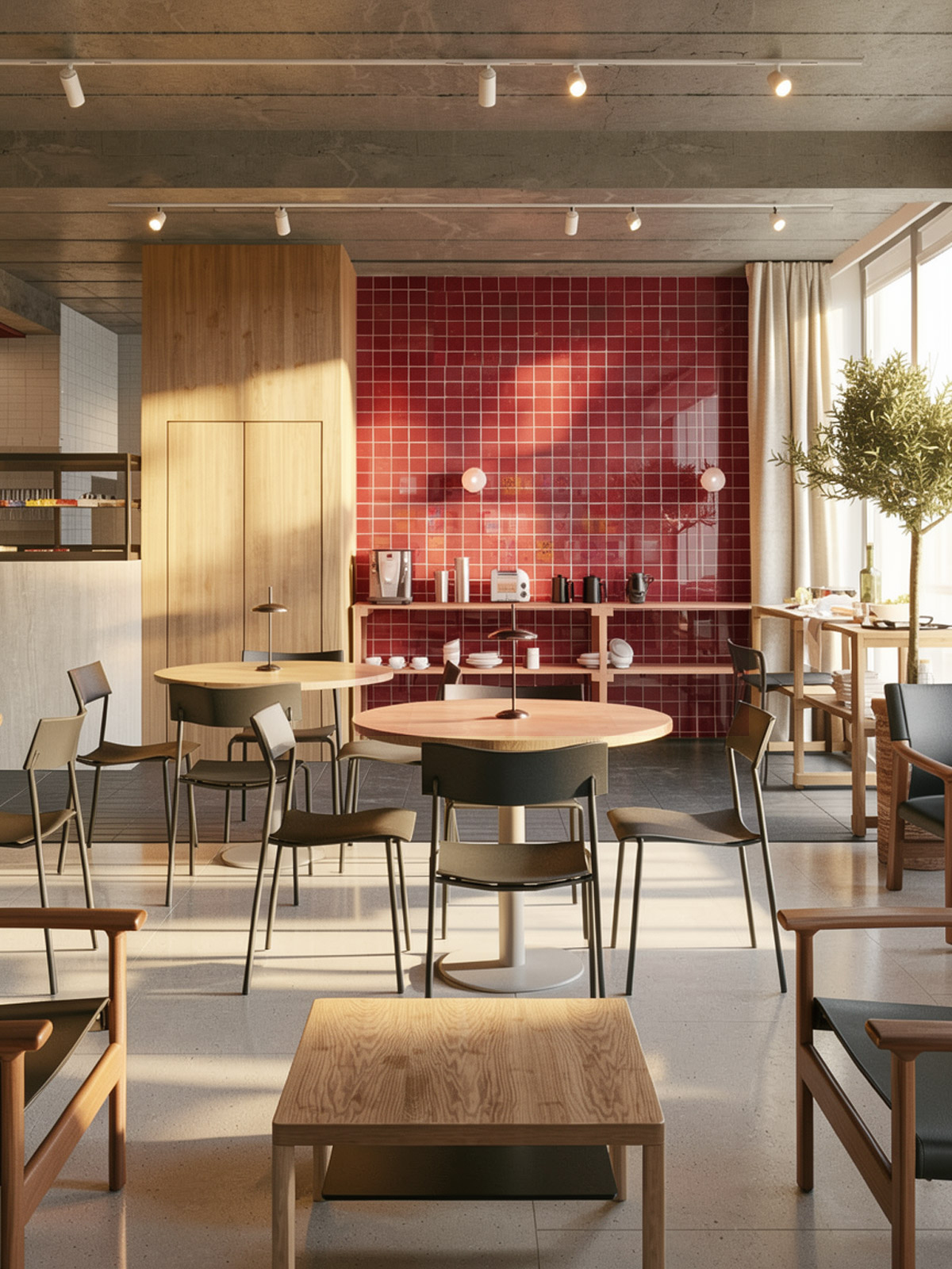 Projekt restauracji hotelowej zakłada stworzenie uniwersalnej przestrzeni, niezwiązanej trwale z jedną marką. Lokal jest przeznaczony zarówno dla gości hotelowych korzystających ze śniadań, jak i dla osób odwiedzających wyłącznie restaurację. Drewniana, harmonijkowa ściana pozwala na wydzielenie dwóch niezależnych stref, dostosowanych do spotkań biznesowych lub wydarzeń rodzinnych.