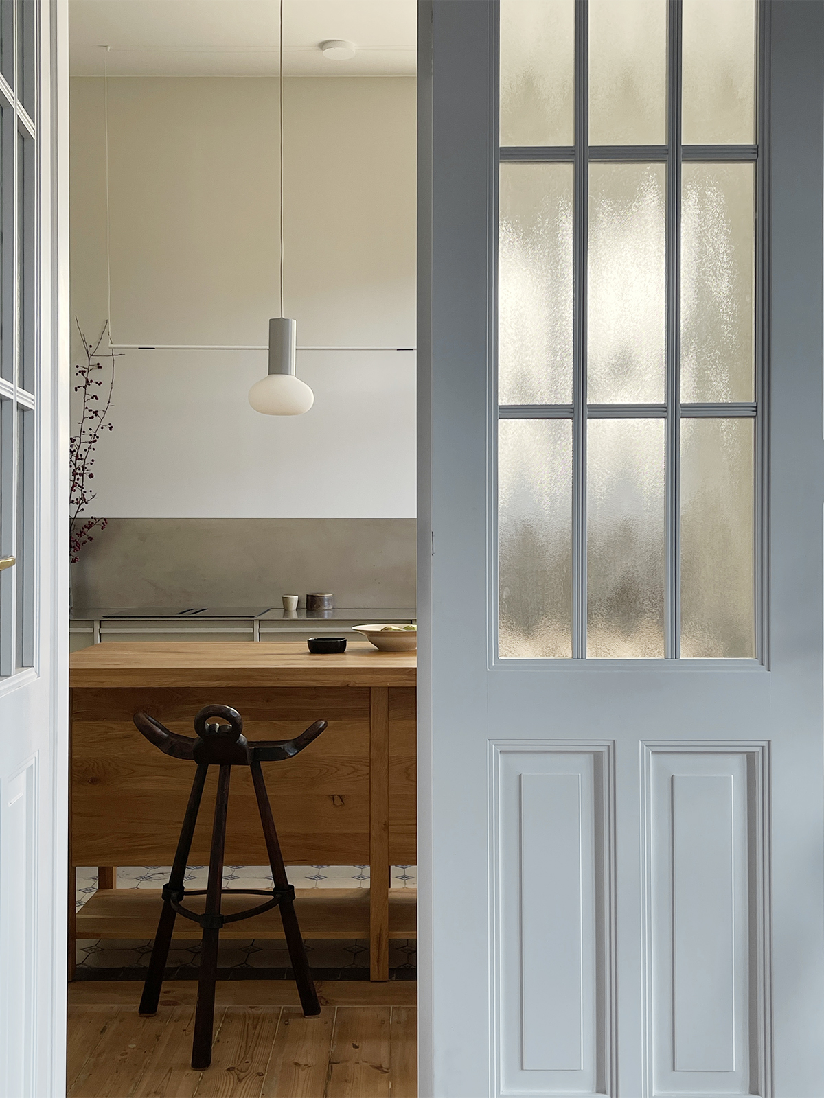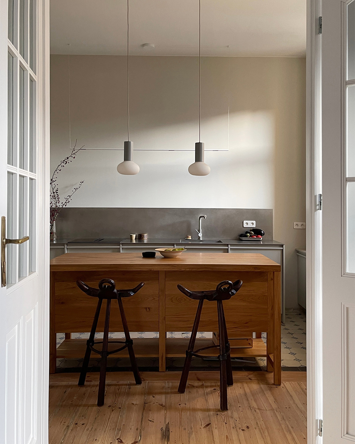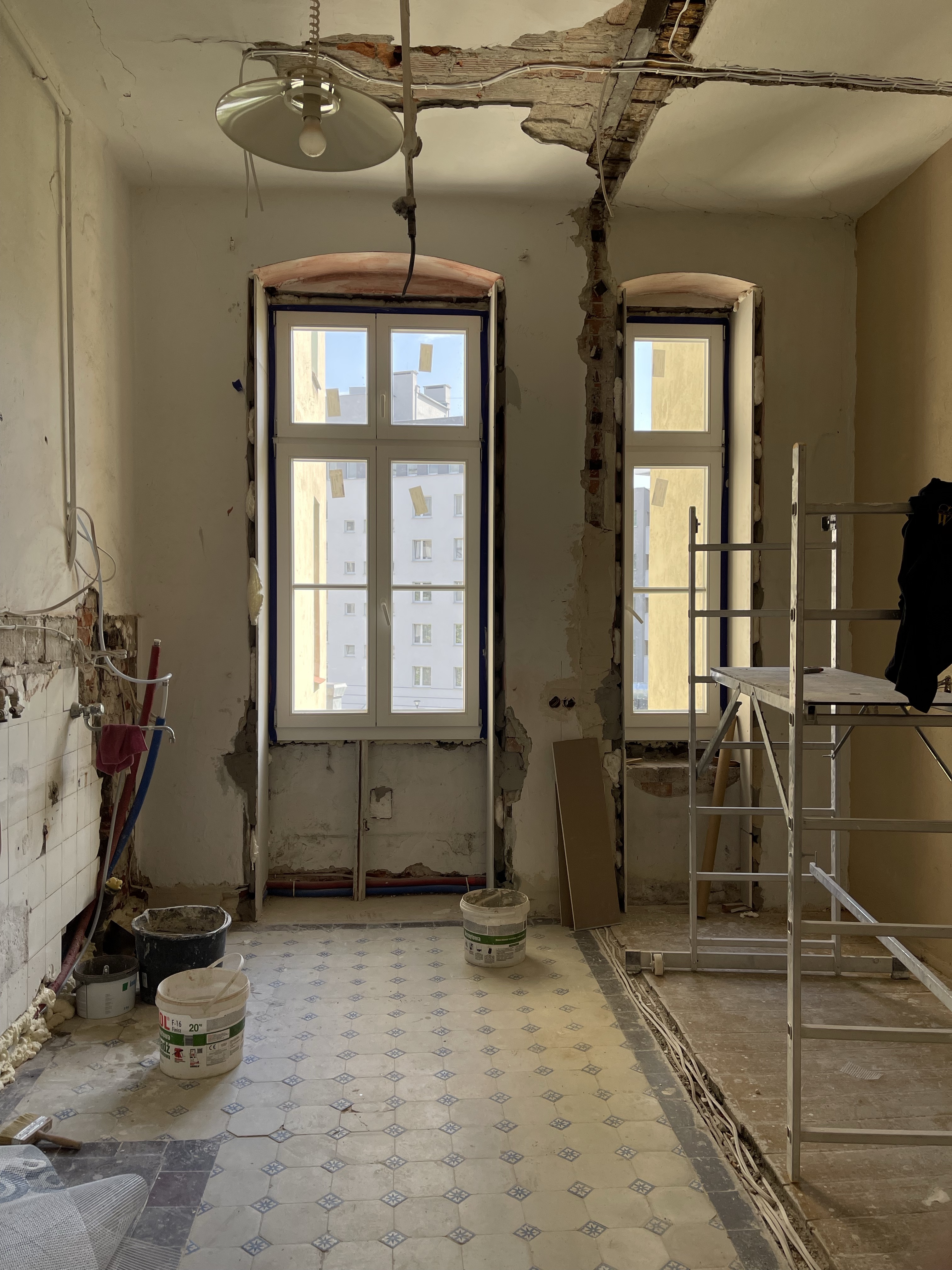 Projekt mieszkania w przedwojennej kamienicy, oparty na zachowaniu oryginalnych elementów oraz przemyślanej zmianie układu funkcjonalnego. Pierwotnie wszystkie pomieszczenia dostępne były z holu, układ ten został zmodyfikowany poprzez powiększenie łazienki oraz połączenie biura z przechodnią kuchnią, gdzie wykonano replikę drzwi dwuskrzydłowych na wzór oryginalnej stolarki. Zachowano i odnowiono historyczne detale takie jak stolarka drzwiowa, sztukaterie, drewniane podłogi oraz oryginalne kafle cementowe.