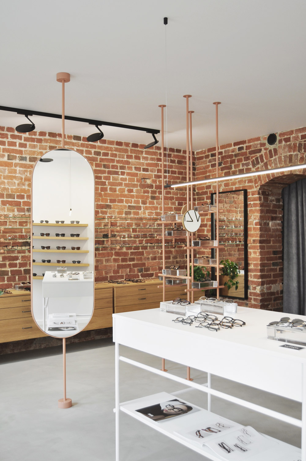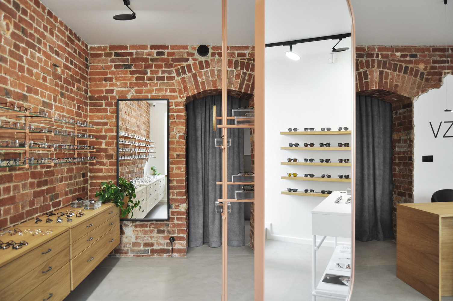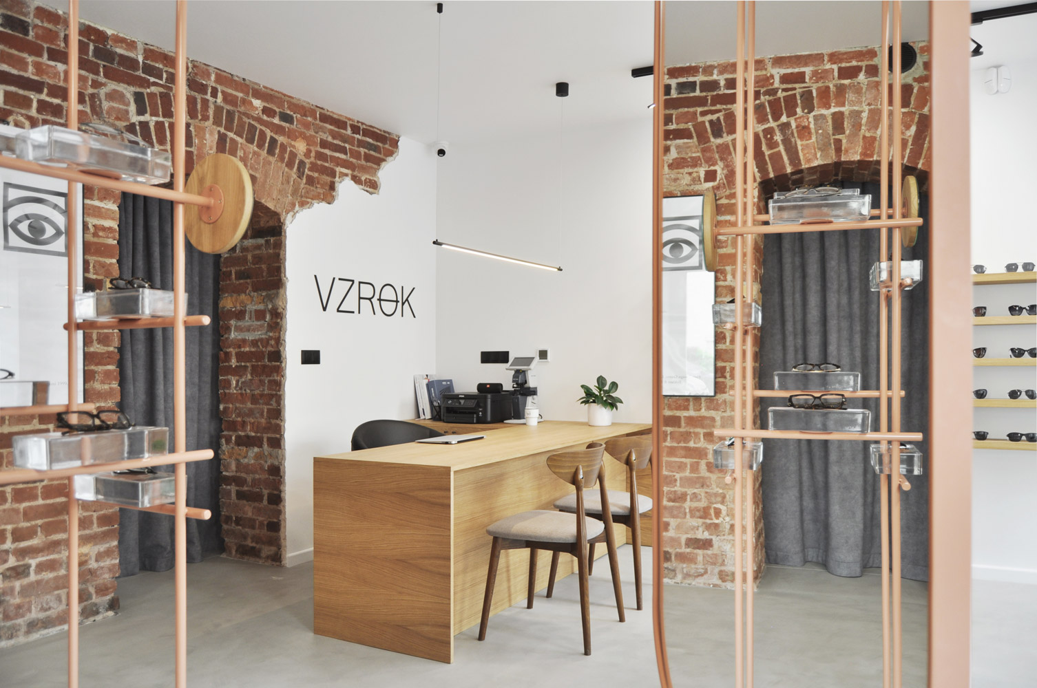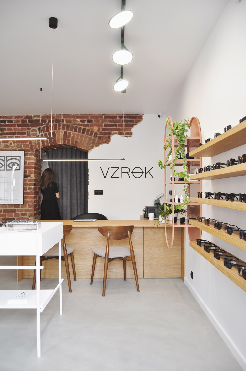 Salon optyczny VZROK powstał w kamienicy na wrocławskim Nadodrzu. We wnętrzu wyeksponowano ceglane ściany i sklepienia, które stały się głównym motywem projektu. Zastosowano białe wykończenia, posadzkę z szarego mikrocementu, naturalne forniry i minimalistyczne czarne oświetlenie. Stalowe konstrukcje w kolorze „Beige Red” tworzą autorskie ekspozytory i lustra. Okulary prezentowane są na szklanych cegłach, nawiązujących do szkła jako kluczowego materiału optyki. Identyfikacja wizualna opiera się na nazwie „vzrok” z minimalistycznym logo tworzącym znak okularów.