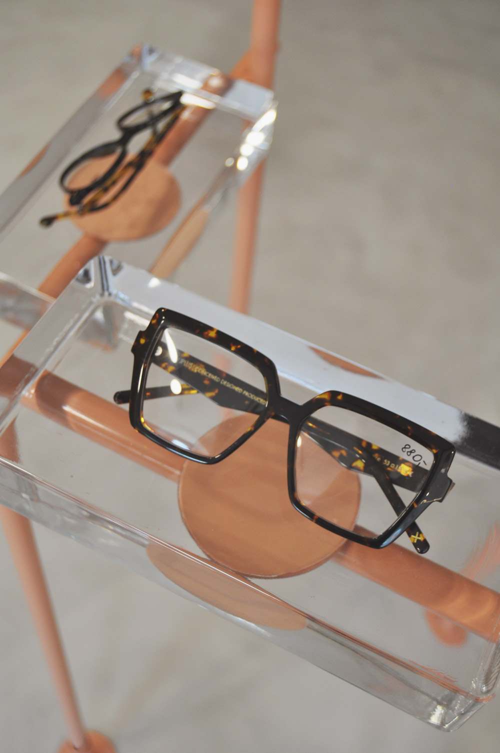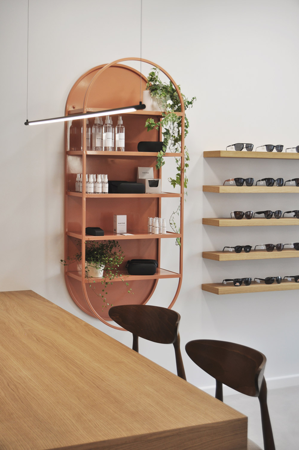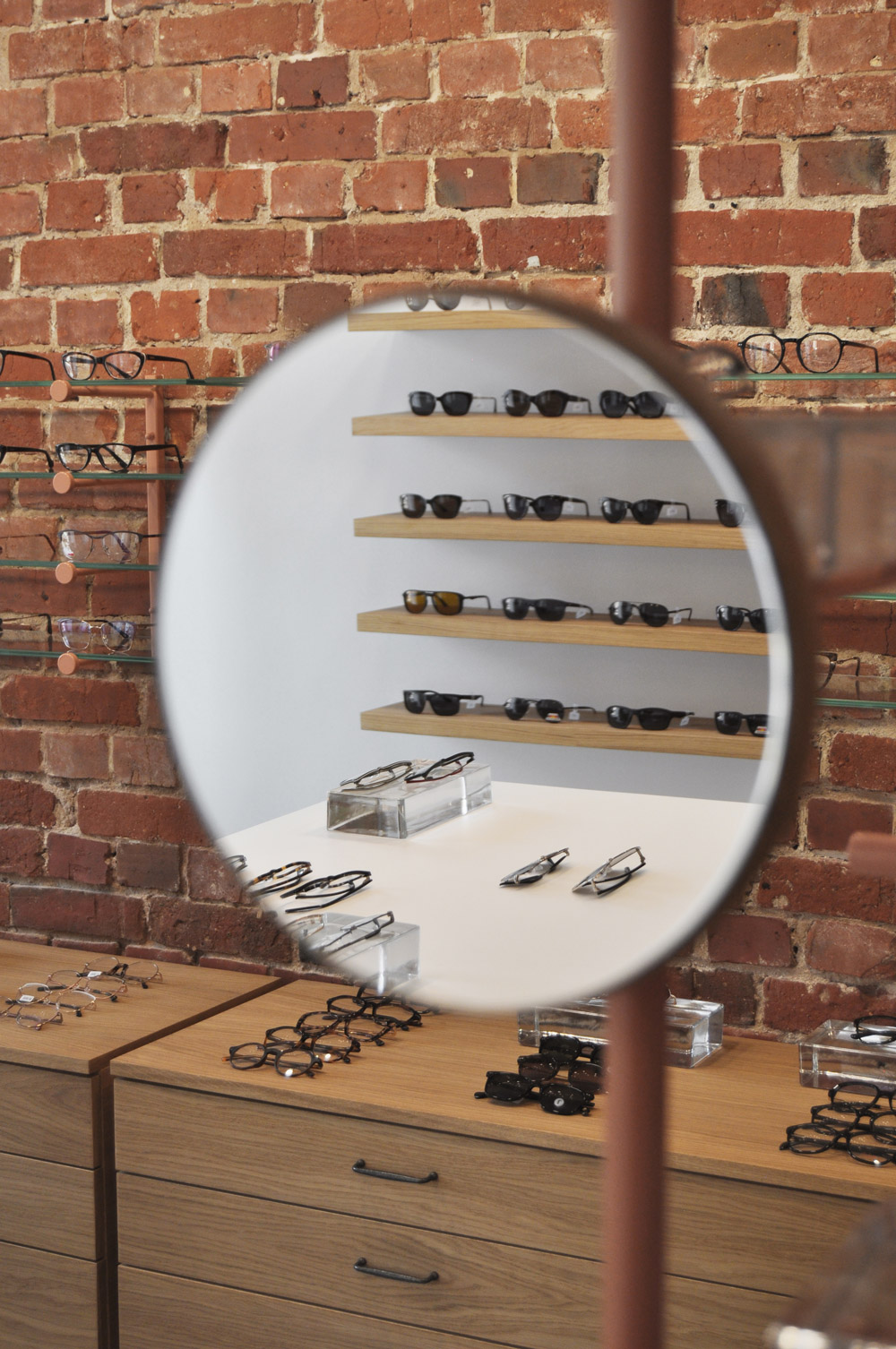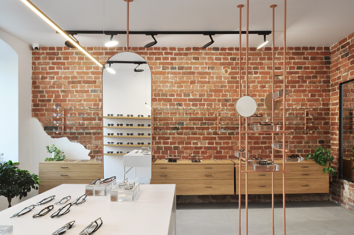 Salon optyczny VZROK powstał w kamienicy na wrocławskim Nadodrzu. We wnętrzu wyeksponowano ceglane ściany i sklepienia, które stały się głównym motywem projektu. Zastosowano białe wykończenia, posadzkę z szarego mikrocementu, naturalne forniry i minimalistyczne czarne oświetlenie. Stalowe konstrukcje w kolorze „Beige Red” tworzą autorskie ekspozytory i lustra. Okulary prezentowane są na szklanych cegłach, nawiązujących do szkła jako kluczowego materiału optyki. Identyfikacja wizualna opiera się na nazwie „vzrok” z minimalistycznym logo tworzącym znak okularów.